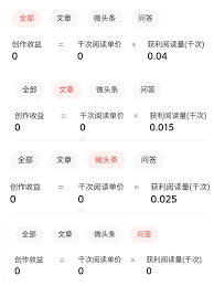 除了广告分成,内容的阅读量也直接影响收益。阅读量越高,收益相对也会增加。阅读量不仅包括文章的阅读次数,还涵盖了视频的播放量等。平台会根据阅读量的多少给予创作者一定的收益奖励。不同类型的内容,阅读量收益可能会有所差异。例如,一些热门领域的优质内容,由于受众广泛,阅读量较高,相应的收益也会较为可观。