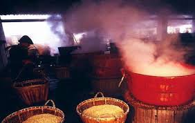 4. 落缸发酵:按比例加入酒曲和水,搅拌均匀后密封发酵,期间产生酒精和各种风味物质。