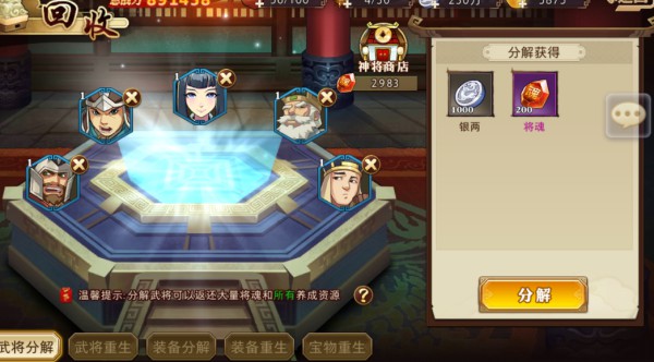 武将分解可以将废弃的武将进行分解,分解后则变成将魂,将魂可以在神将商店购买武将碎片及武将养成道具。