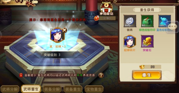 使用武将重生功能,可以把玩家阵容中替换下来的武将以碎片的形式返还。同时,该武将升级、突破、将星、觉醒、心法所消耗的资源。也全部100%返还给玩家。将要重生的武将放入到重生槽内。右侧则显示出该武将养成时所消耗的资源道具。