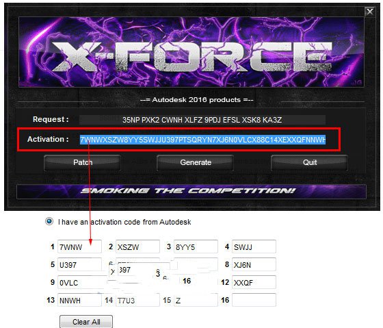 13、打开注册机,将复制好的reauest code代码粘贴到注册机reauest框中,再点击generate得到激活码;