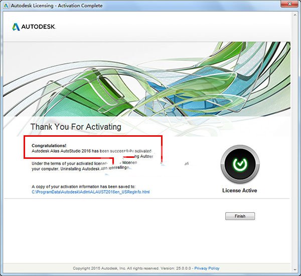 15、可以看到这样的字样“Congratulations! Autodesk Alias AutoStudio 2016 has been successfully activated.”说明软件已经成功注册激活,现在可以无限制免费使用;