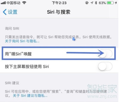 2、接着点击开启用“嘿Siri”唤醒开关,如下图所示: