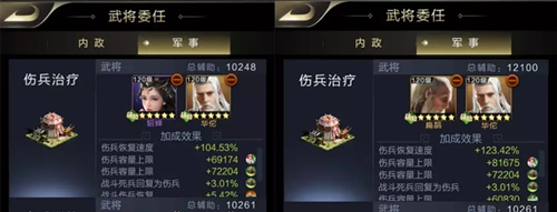 从面板上看,扁鹊医馆容量比貂蝉高了73331,体验服貂蝉没有做【病榻】兵法属性上亏一些。但扁鹊的作用同样没有完全体现————在委任后,实际数值相差还要更大一些: