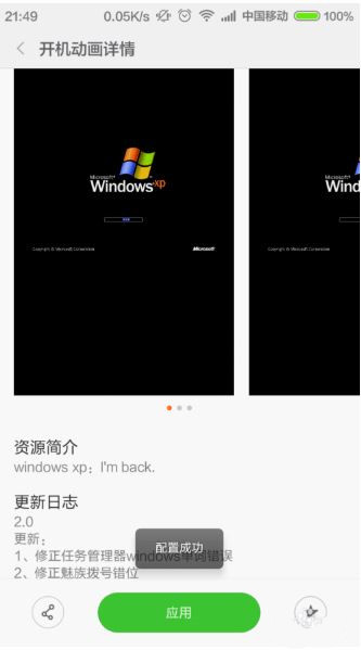 4、下载完毕之后,点击界面中的“应用”按钮,等到出现“配置成功”的消息提示之后,我们的开机动画便成功更改了。