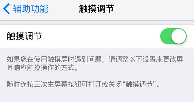 “触摸调节”包括多个功能。如需使用这些功能,首先请前往“设置”-“通用”-“辅助功能”-“触摸调节”,打开“触摸调节”。