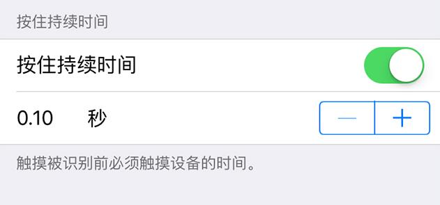 如果您希望手指按在屏幕上,达到某段时间之后设备才会响应触摸,可以对“按住持续时间”进行调整。