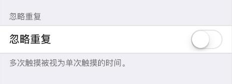 在“触摸调节”中,打开“忽略重复”,轻点“-”和“+”可更改时间。