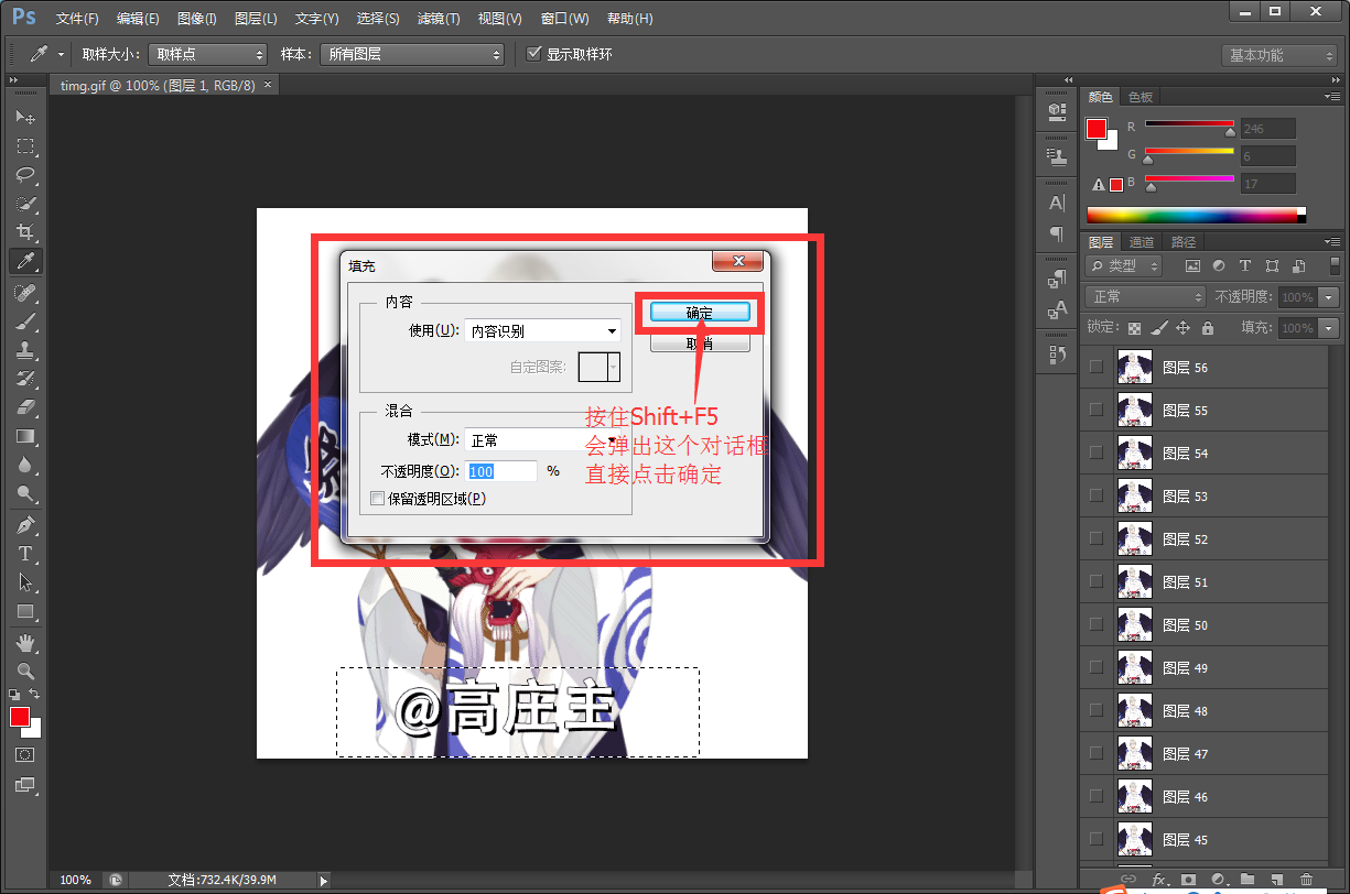 4.选中之后,不要有其他动作,直接同时按住键盘上Shift + F5键,这时候会弹出一个对话框,不用管这个对话框,直接点击确定。