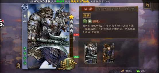 庞德的技能“马术”使他与其他角色计算距离时始终-1,在场上能更灵活地接近敌人或远离危险,增强了其行动的机动性。“猛进”则是在使用杀指定一名目标后,若此杀被目标角色使用的闪抵消,庞德可弃掉一张牌,然后令目标角色本回合非锁定技失效且不能使用或打出手牌。这两个技能的配合,让庞德在进攻端有了一定的威慑力。