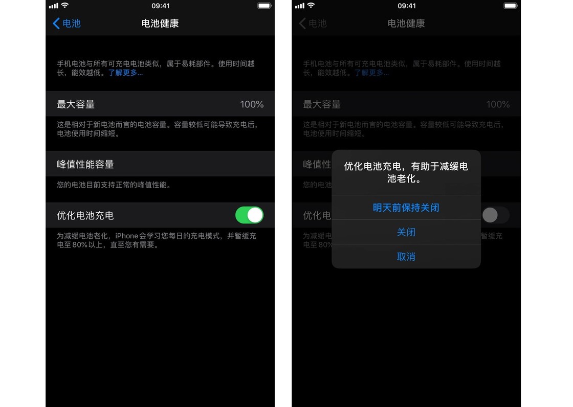 开启后,iPhone 会借助机器学习能力,基于用户使用习惯有根据的调整充电策略,在手机长时间连接电源的情况下,只会充至 80%,在次日清晨用户拔下电源之前才尽可能地将电池充满,避免了深充,也能保证当天的续航。