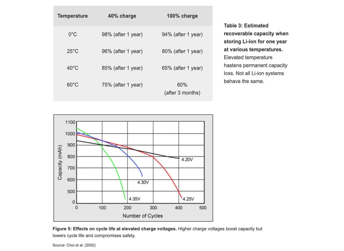 极限高温和高充电电压都将会影响电池寿命,前者会加速电池不可逆的寿命损坏,后者虽然可以在短时间内提高电池容量,但会加速衰竭电池循环寿命。