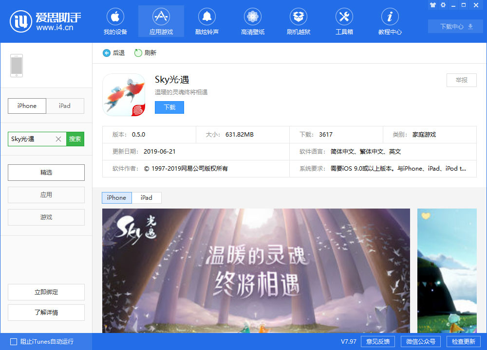 连接手机后,通过 PC 端「游戏爱好者」或 iOS 端「爱思加强版」可以直接搜索并下载 Sky 光·遇。