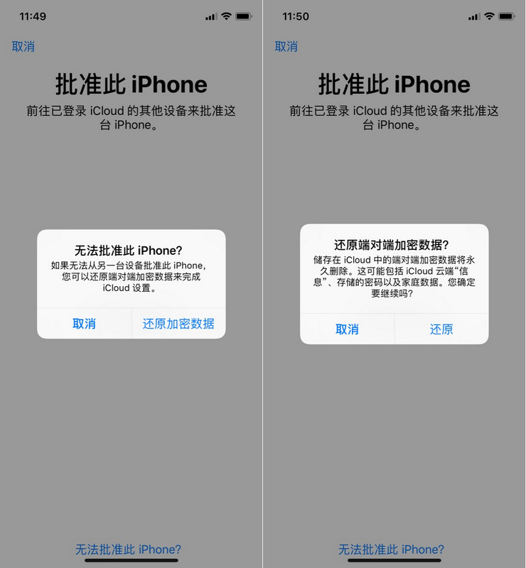 如果无法在登录该 Apple ID 的设备上获取验证码,可以点击屏幕下方的“无法批准此 iPhone”按钮,选择“还原加密数据”后可以继续激活,但是这样一来备份在 iCloud 上的部分数据也会被删除。