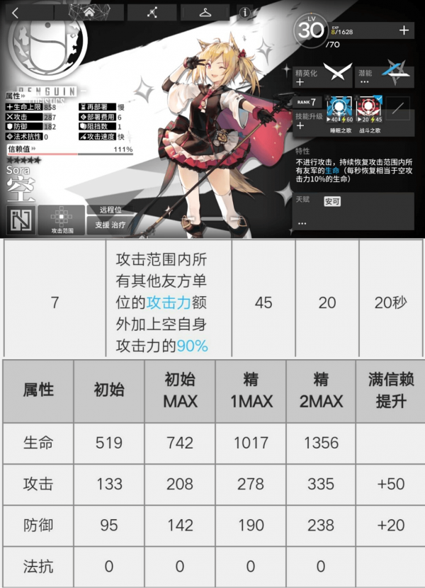 因为空自身的攻击力属于舟游垫底地位,实际上空攻击300,技能七级的情况下收益只有270的固定值收益。但是胜在全体增幅,不像华法琳有些不稳定,在法师队中的收益还是比初雪要大的。因为是全体增加,奶妈也会获得这个攻击力加成,可以极大的缓解医疗压力。