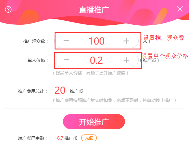 2、在设置窗口中选择需要推广的观众数,单个观众价格(即通过推广获得一个观众支付的推广币。出价越高直播间得到的展示机会越多,获得观众速度越快),点击“开始推广”即可开始推广;
