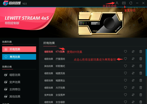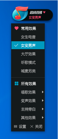 4、点击心型可将效果设置为常用音效,常用音效出现在悬浮窗口,可一键切换使用;