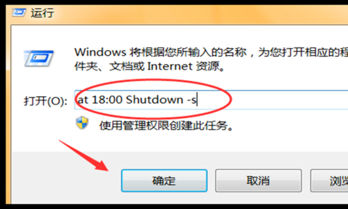 2、在命令框里面输入【at 18:00 Shutdown -s】,点击【确定】;