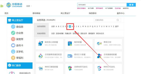 1、在电脑上进去中国移动网上营业厅,点击【业务办理】;