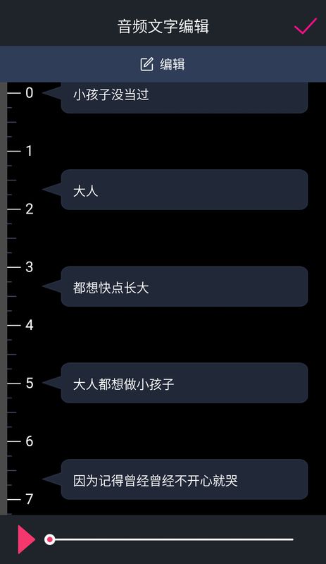 4、录完声音之后,会自动给我们分段换行,十分的人性化,还可以添加背景音乐和背景图,点击右上角的√。