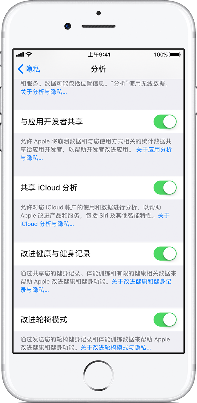 iOS 设备分析包含了硬件和操作系统方面的详细信息、性能统计数据、设备和应用程序的使用数据。任何被收集的信息都无法用来识别用户身份,个人隐私数据在发送给苹果之前会被自动移除。