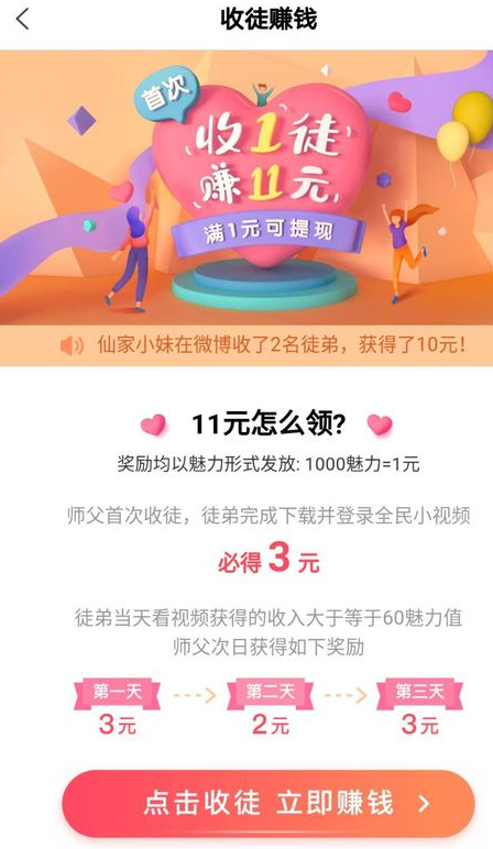 2、可以通过收徒赚取现金,每成功收徒一个,赚取11元。