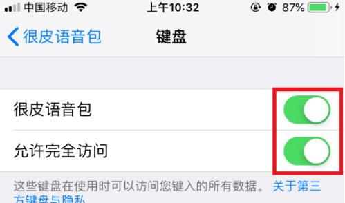 4、之后我们把【很皮语音包】和【允许完全访问】都打开就可以了。