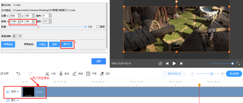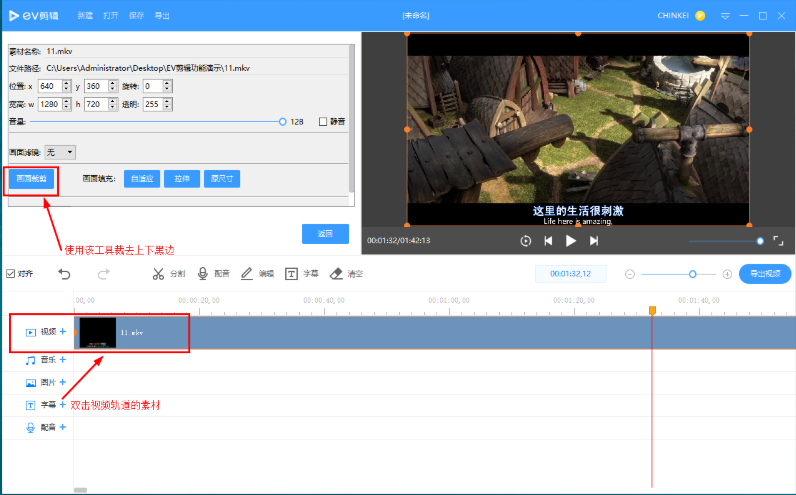 我们需要先打开EV剪辑工具,导入视频素材,双击视频轨道的素材,点击“画面裁剪”,去除上下黑边,