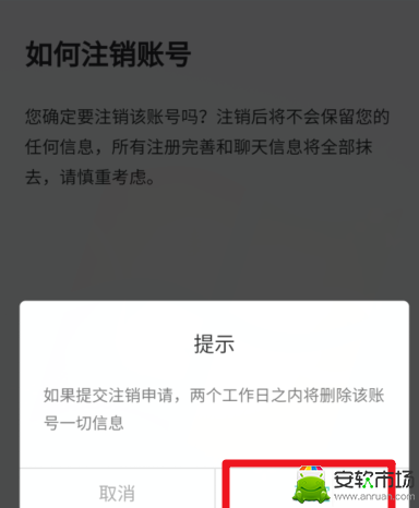 4、之后按照提示点击确定注销,之后就可以等待审核了,一般会在两个工作日内完成。