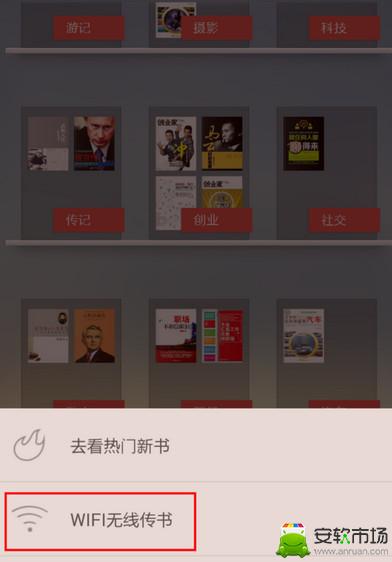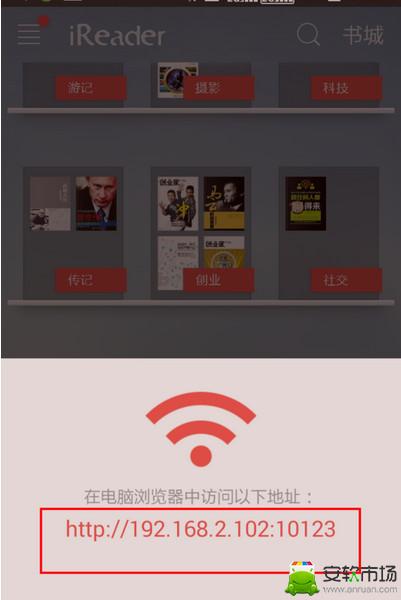 1、下载打开【Iread】软件,点击书架上的【+】号,点击选择【WiFi无线传书】;
