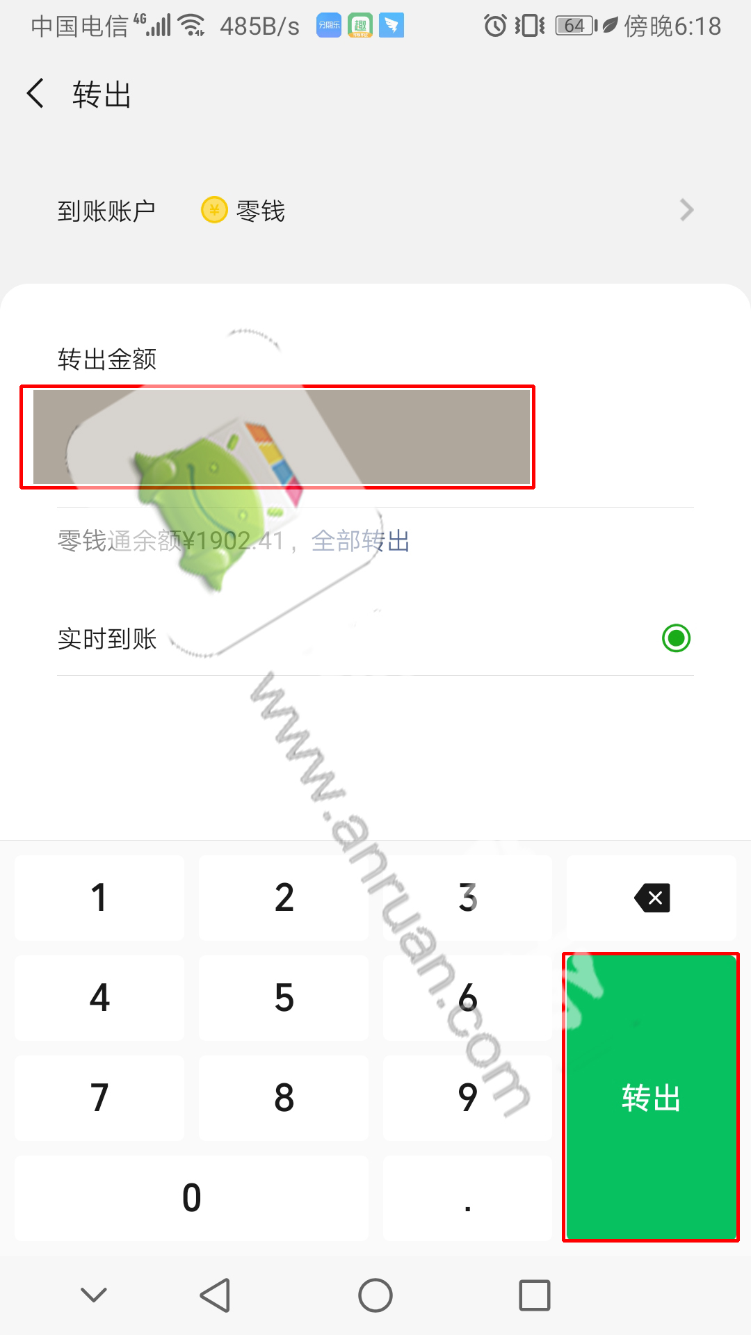 5、在到账账户那边选择【零钱】,然后输入转出金额;