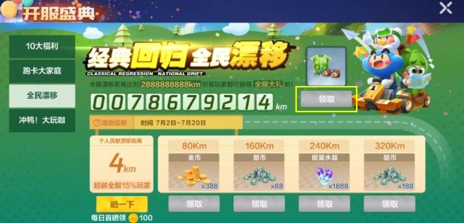 2、进入开服盛典活动页面后,点击全民漂移活动,活动任务达成后点击领取即可。