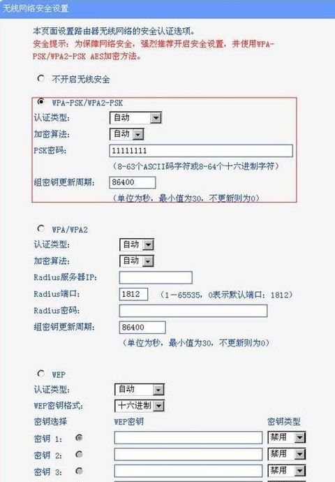 3、在无线设置无线安全设置中设置无线信号加密信息,记录该无线路由器设置后的SSID、信道和加密设置信息;