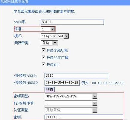 2、在无线设置基本设置中设置【SSID号】、【信道】,设置固定信道号,如图;