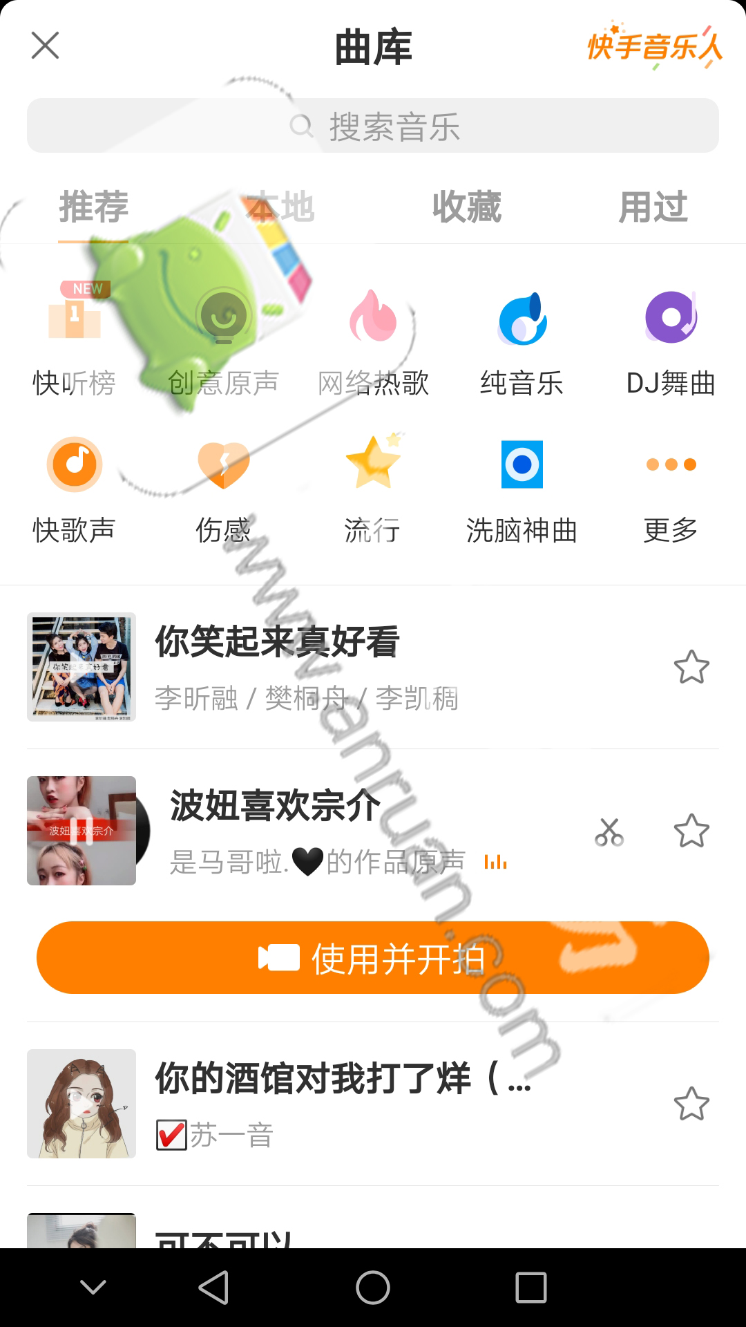 2、点击自己喜欢的音乐,然后点击【使用并开拍】;