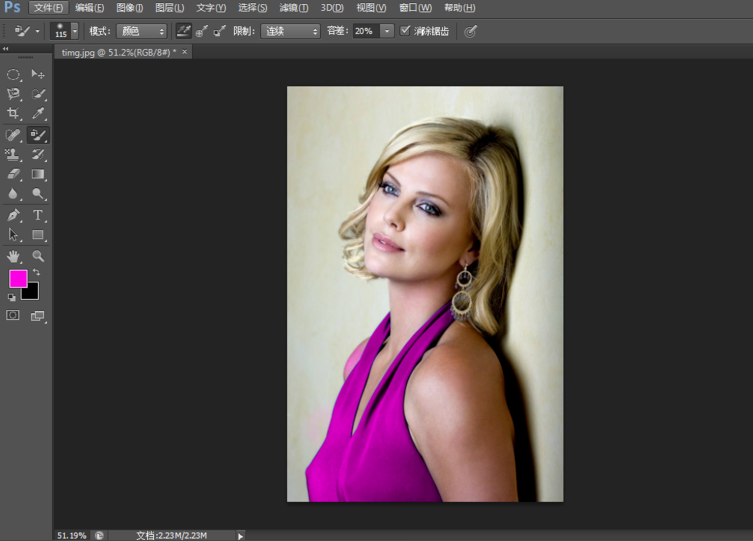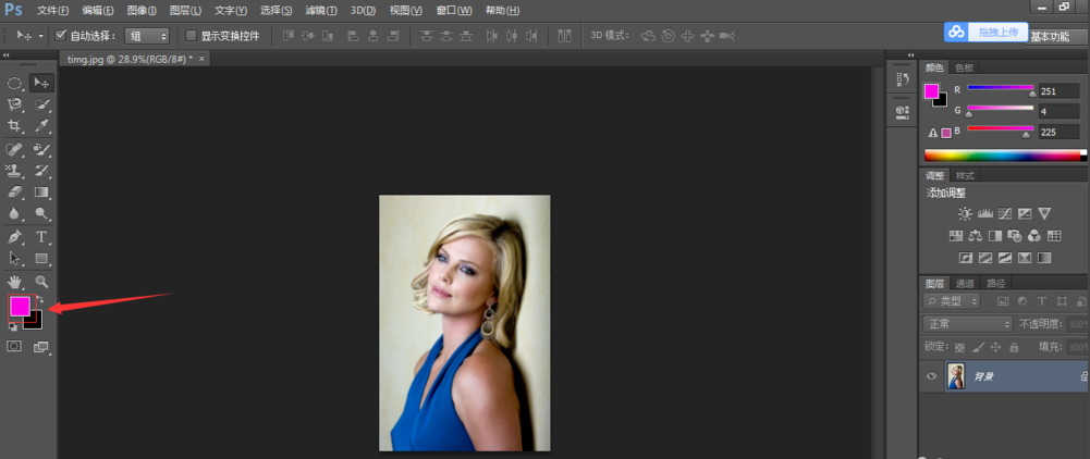 打开Photoshop软件,导入一张图片,选择前景色为想要替换成的颜色,这里我选紫红色,