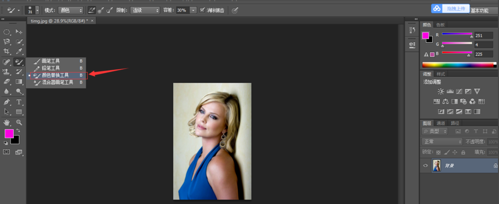 在左侧工具栏中选择颜色替换工具,如图,