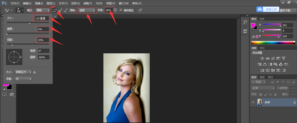 在上方工具栏中设置画笔大小、硬度、间距,选择模式为【颜色】,限制为【连续】,容差为20%,如图,