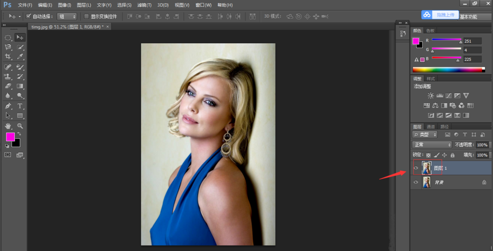 将图片导入PS软件,按【Ctrl+J】,复制一个图层,如图,
