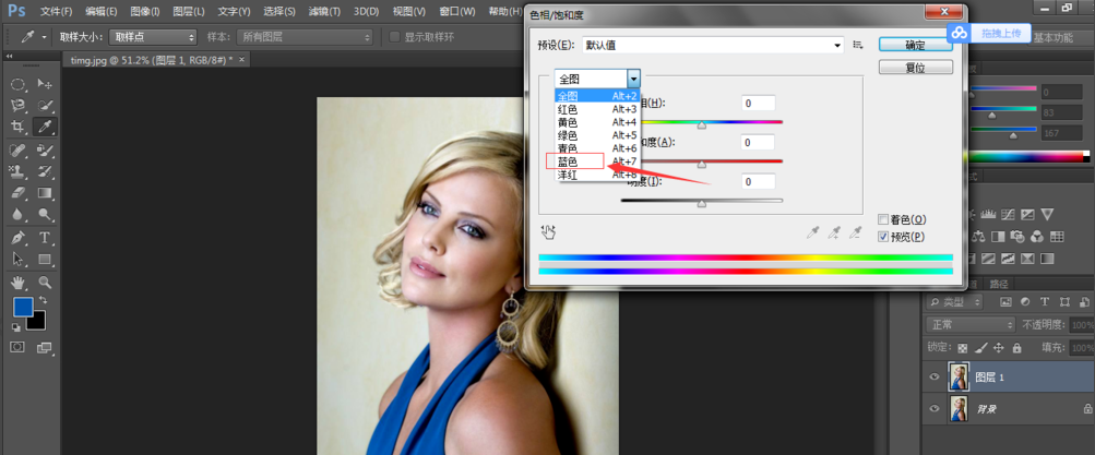 按【Ctrl+U】,打开色相/饱和度面板,点击【全图】,在下拉菜单中选择一个颜色,我选择蓝色,