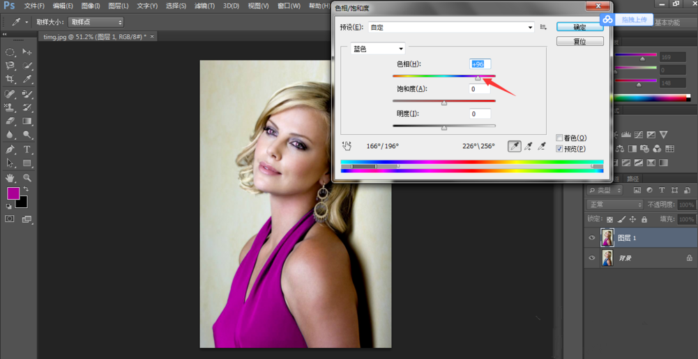 拖动【色相】下面的小滑块,发现衣服颜色会随之不停变化,选取合适的色相值,衣服变成了紫红色,点击确定,