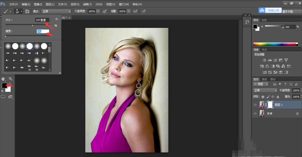 选择黑色为前景色,调整画笔大小、硬度,在建立的蒙版上对除了衣服之外可能变色的部分进行涂抹,露出下层图层原本的颜色,