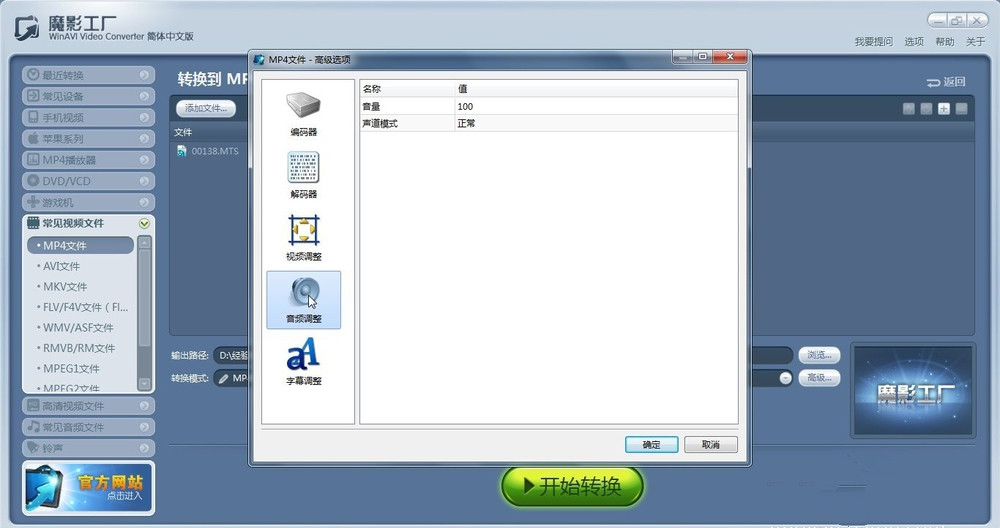 打开魔影工厂,进入主界面,在左侧点击【常见音频文件】,选择格式,弹出对话框,导入视频文件,
