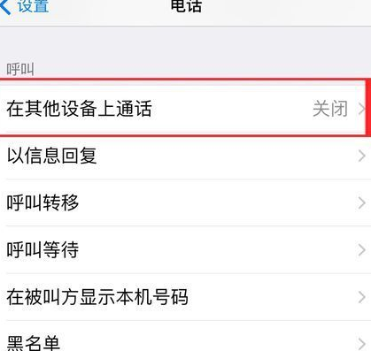 2、之后,我们进入【设置】中点击【电话】,在电话中关闭呼叫中的“在其他设备上通话”;