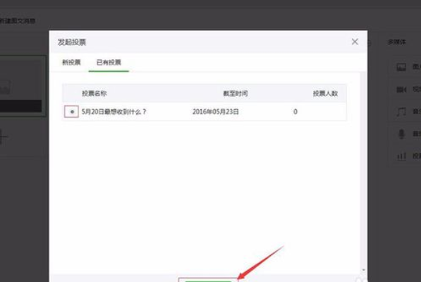 7、在已有投票选项下,可以看到刚才在“投票管理”处新建的投票,我们可以选择刚刚新建的投票点击下面的“确定”即可。