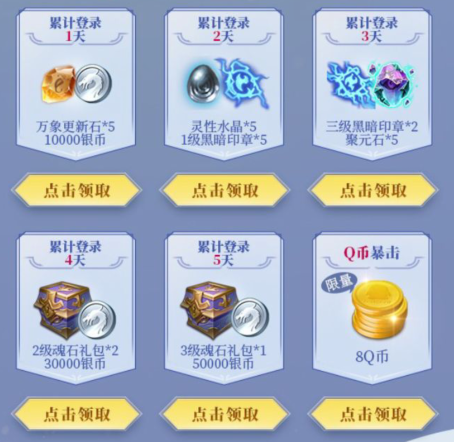 3、累计登录游戏即可解锁累计登录礼包,成功登录5天后即可参与暴击Q币,Q币数量有限,先到先得;
