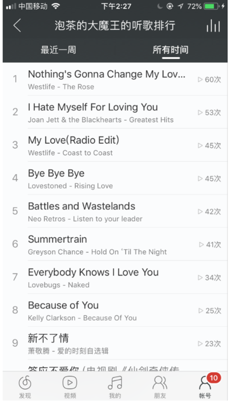 5、在听歌排行中,我们可以看到听歌的时间以及次数了,最后点击【所有时间】就可以查看听歌时间了。