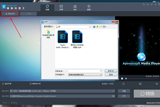 1、首先需要先进入到软件的主界面中,点击添加文件;添加想要将清晰度变为超清的视频文件,软件支持所有类型的媒体格式,选择后点击打开;即可,如下图所示: