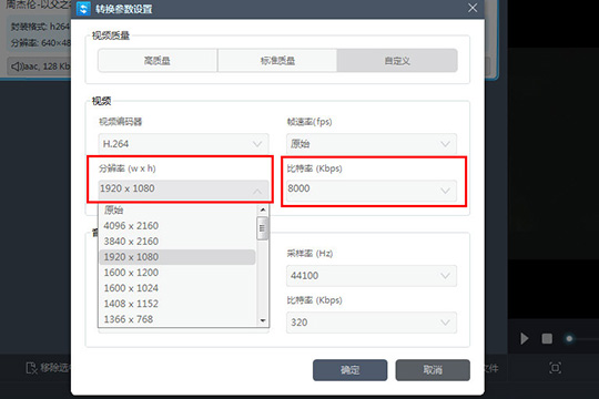 5、弹出转换参数设置的界面后,由于软件默认是标准质量,你可以在视频质量中选择高质量;或自定义;进行调整,其中分辨率;与比特率;就是影响视频画面质量的关键,更改完毕后点击确定;即可,如下图所示: