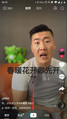 1、打开抖音的播放页面,然后在播放页面中点击下面的拍摄按钮;